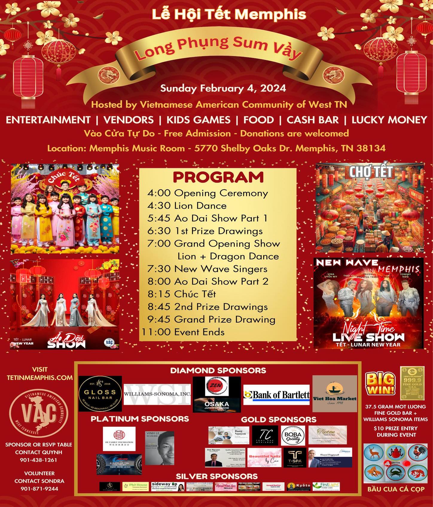 Lễ Hội Tết Giáp Thìn năm 2024 được tổ chức vào Chủ Nhật, ngày 4, tháng 2, năm 2024, tại Memphis Music Room, 5770 Shelby Oaks Dr